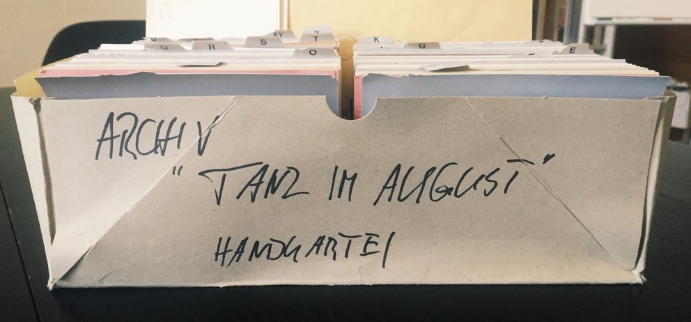30 Jahre “Tanz im August“? Wie war das nochmal? Wer? Wo? Wann? Suchen, suchen, vielleicht finden, weitersuchen, endlich finden, ausbreiten... Hätte es nicht auch ein Gang ins Archiv getan? Nein, denn es gibt kein Archiv, das die Geschichte des Festivals “Tanz im August“ dokumentiert. Keine Zeit, keine Leute, kein Geld – das Übliche. Dafür gibt es Kartons, die an verschiedenen Orten verstaut wurden, z.B. im HAU Hebbel am Ufer; in privaten Archiven und persönlichen Erinnerungen. Es gibt Findbücher und Akten in Archiven, z.B. in der Akademie der Künste. Es gibt Fotograf*innen mit Archiv. Es gibt die Mediathek für Tanz und Theater am Internationalen Theaterinstitut/Mime Centrum, die nie als Archiv gedacht war aber eines wurde:
