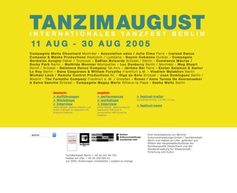Auch 2005 ist TANZ IM AUGUST Treffpunkt für die internationale Tanz- und Performancekunst. Das Festival nutzt in diesem Jahr mehr als 10 Bühnen, dazu open-air-Orte und das Kino Arsenal. Besonderes Augenmerk haben wir in diesem Jahr auf die Auseinandersetzung und Interaktion zwischen zeigenössischem und klassischem Tanz gelegt.