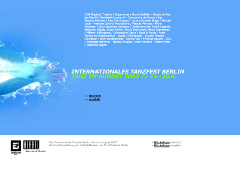 15 years of “Internationales Tanzfest Berlin - Tanz im August” offers an impressive resume. The Festival is co-presented by two partners, the Hebbel-Theater and the TanzWerkstatt Berlin, who have developed the diverse program through a continuous dialogue - and have made “Tanz im August” into one of the most attractive international dance festivals.