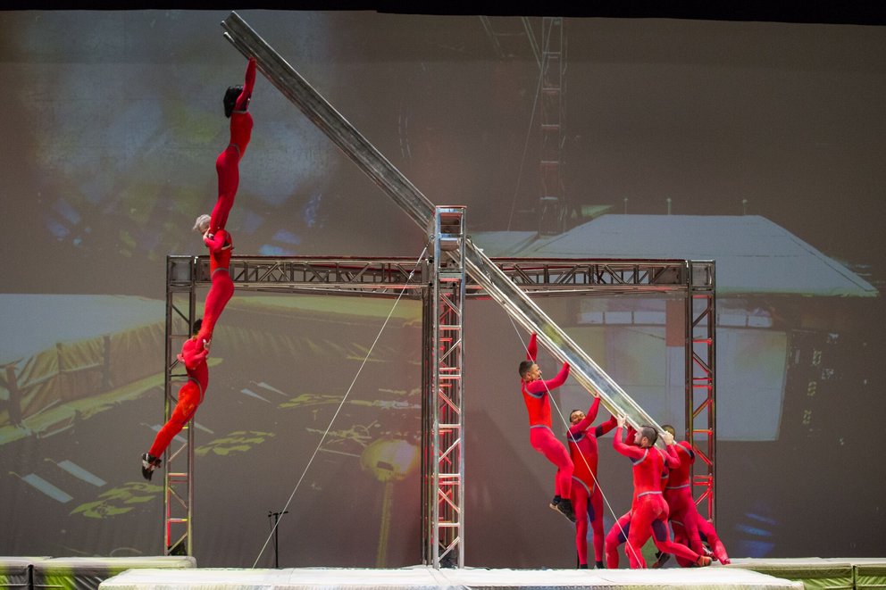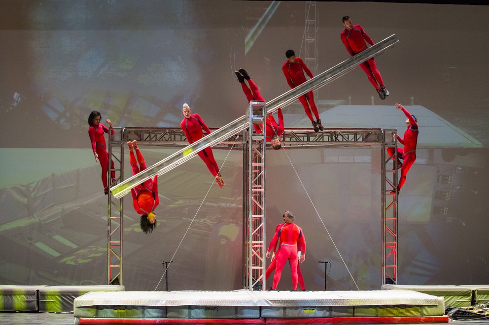 In the fast-paced hour that followed, eight dancers—or action heroes, as they’re officially called—flirted with danger as they flew through the air, squeezed into tight spaces, and smashed into hard surfaces. In one piece, they scaled a towering wheel, running atop it and leaping from its frame; in another, they catapulted themselves from a giant trampoline onto the floor below. Music played, but just as rhythmic was the “thud” of flattened bodies hitting the ground. Mattresses cushioned the blow.