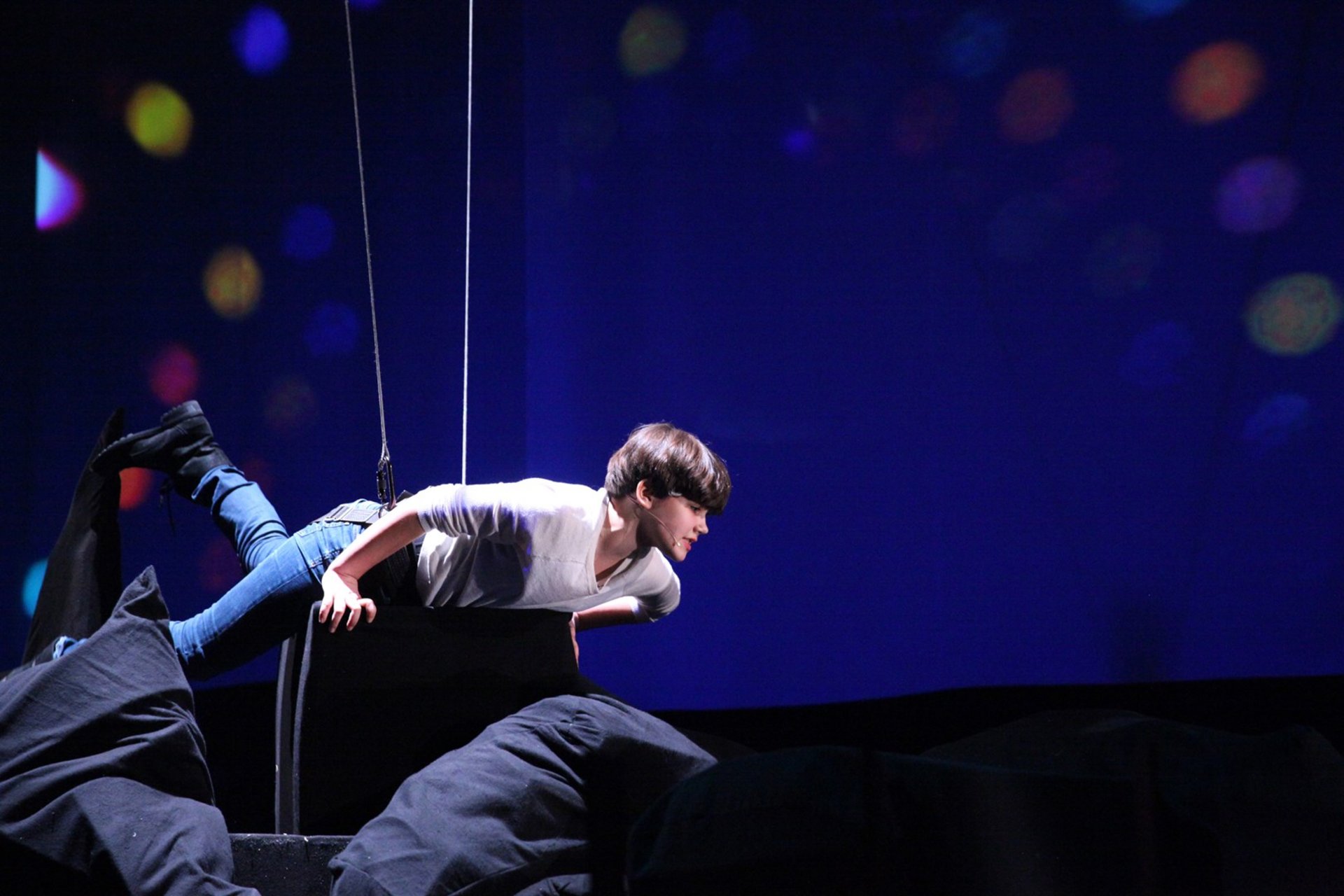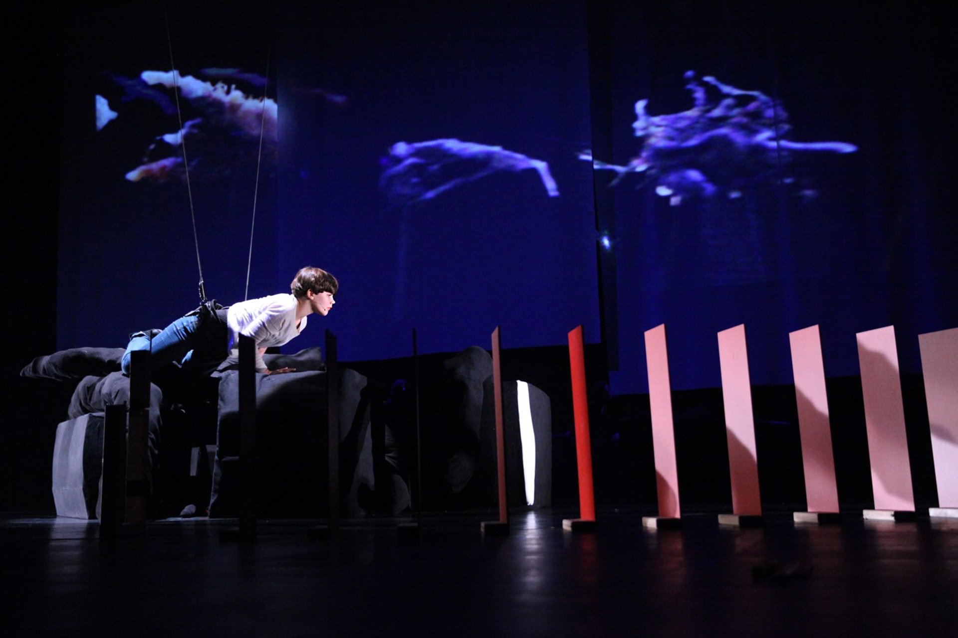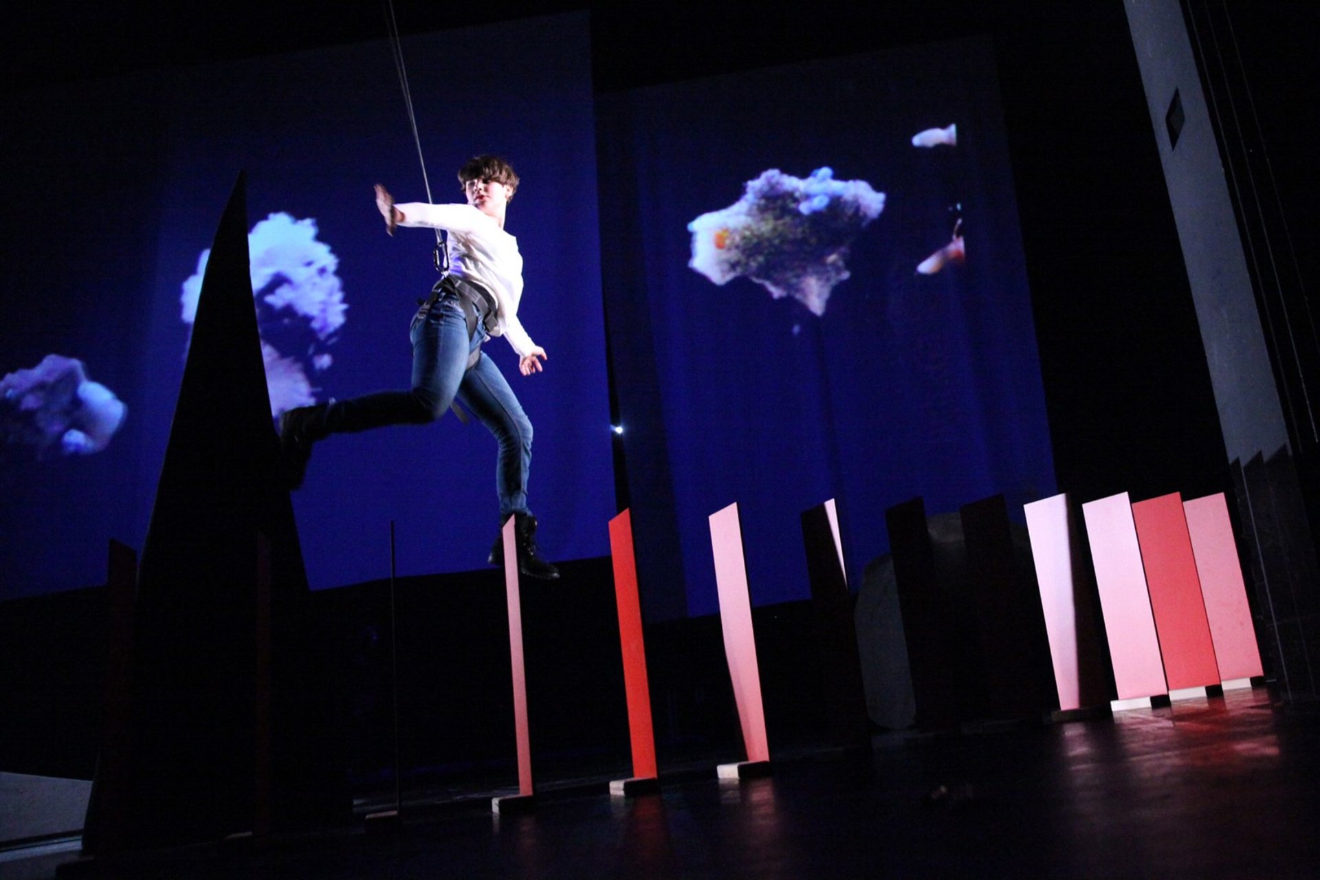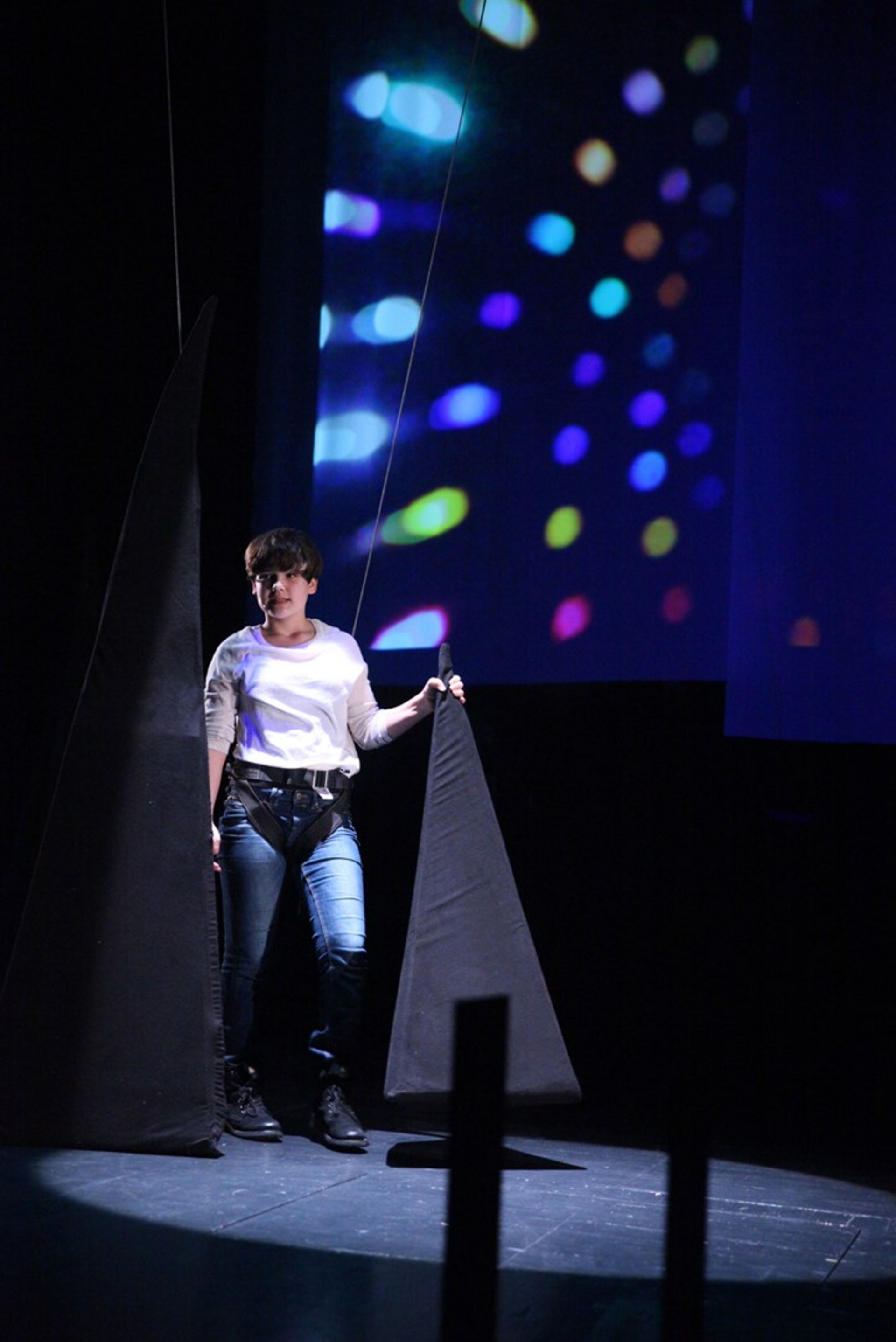 Heracles 2 gets lost in the forest of his own words. The young performer Rita Stelling tries to pull him out using the stage machinery.