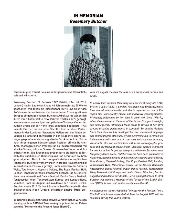 “Memory in the Present Tense”, Berlin is a production of Tanz im August / HAU Hebbel am Ufer in collaboration with the Akademie der Künste. Supported by Arts Council England, British Council, Middlesex University, Why Not Assosiates, Dance 4 / Nottdance Festival, Tanztendenz München, Städtische Galerie im Lenbachhaus in collaboration with Joint Adventures München.