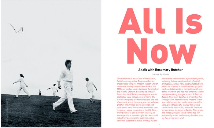 The publication Memory in the Present Tense documents Rosemary Butcher's archive project for the festival Tanz im August 2015 at the Akademie der Künste in Berlin and is a contribution to the sustenance and dispersal of Rosemary Butcher’s ‚traces and memories‘. It contains photographs of the exhibition and its artefacts, a conversation with the curator and dance scholar Sigrid Gareis about Butcher’s body of work, her career and the Berlin retrospective and two transcriptions of talks that took place during the festival: one with the choreographer and dance scholar Susan Leigh Foster on Butcher’s recent pieces “The Test Pieces”and “Secrets of the Open Sea”, the exhibition for Berlin and her work as a teacher, and a talk with Lucinda Childs and Virve Sutinen about the Judson Church movement, Child’s and Butcher’s view of it, how it influenced their works and their recent archive projects.