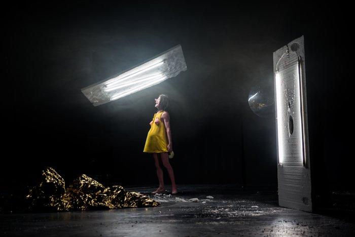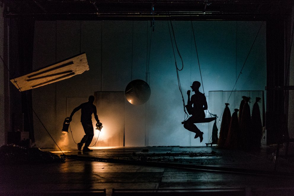 Diese Wesen weisen weder ein eindeutiges Geschlecht noch eine bestimmbare Kultur auf, eines ist grotesk geschminkt, das andere trägt eine Maske. Die Hauptfigur ist ein humanoides Wesen mit Wasserkopf, rosa Haut und Stupsnase, das entweder schwanger oder kräftig gebaut ist. Es wird begleitet von einem Assistenten, einem Untermenschen, der im Schatten des Wesens agiert. Sein Aussehen wirkt wie ein Magnet und weckt unsere Neugier – die Verführung, würde Freud sagen, ist bei Laskaridis visueller Natur. Sie beruht auf Effekten, die den Blick des Publikums auf sich ziehen, indem sie die Lust am Bizarren und Ungewöhnlichen ansprechen. “TITANS” ist auch inspiriert von Unterhaltungsformaten wie Zirkus, Vaudeville oder Kabarett, in denen die Verwandlung eine zentrale Rolle spielt. Diese Funktion wird von dem Bühnenbild übernommen, obwohl dieses sich auf eine minimalistische Bastelei beschränkt, die manchmal an ‘arte povera’ erinnert. Es gibt einen einzigen geschlossenen Handlungsort (ein ‘huis clos’), der eher häuslich wirken könnte, wären da nicht die hängenden Elemente, die Leere und die Dunkelheit, die dem Alltäglichen etwas Überirdisches verleihen, und an ein dekonstruiertes Planetenmobile oder die Ruinen eines verlorenen Paradieses erinnern. Dieser karge, sich stetig wandelnde Ort macht auch die Wandelbarkeit der sich dort bewegenden Identitäten sichtbar.