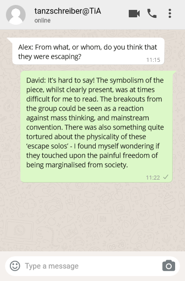 Das ist schwer zu sagen! Obwohl die Symbolik des Stücks direkt sichtbar war, fiel es mir zum Teil schwer, es zu verstehen. Die Ausbrüche aus der Gruppe könnte man als Gegenreaktion zum Denken der Masse und den Konventionen des Mainstreams interpretieren. Die körperliche Dimension dieser ‚Ausbruchs-Solos’ hatte außerdem etwas sehr Gequältes, so dass ich mich fragte, ob sie auf die scherzhafte Freiheit, die mit gesellschaftlicher Ausgrenzung einhergeht, anspielen sollte.