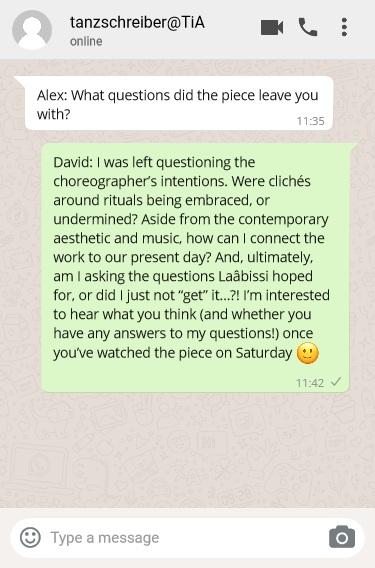 Ich habe mich gefragt, welche choreografischen Intentionen dahintersteckten. Wurden Klischees im Zusammenhang mit Ritualen bestätigt oder eher unterminiert? Wie kann ich das Stück, abgesehen von seiner zeitgenössischen Ästhetik und Musik, mit der Gegenwart in Verbindung setzen? Und schließlich frage ich mich, ob ich Fragen stelle, auf die Laâbissi gehofft hat. Oder habe ich es einfach nicht ‚verstanden’? Es würde mich interessieren, wie du das siehst (und ob du Antworten auf meine Fragen hast!), wenn du das Stück am Samstag siehst :)
