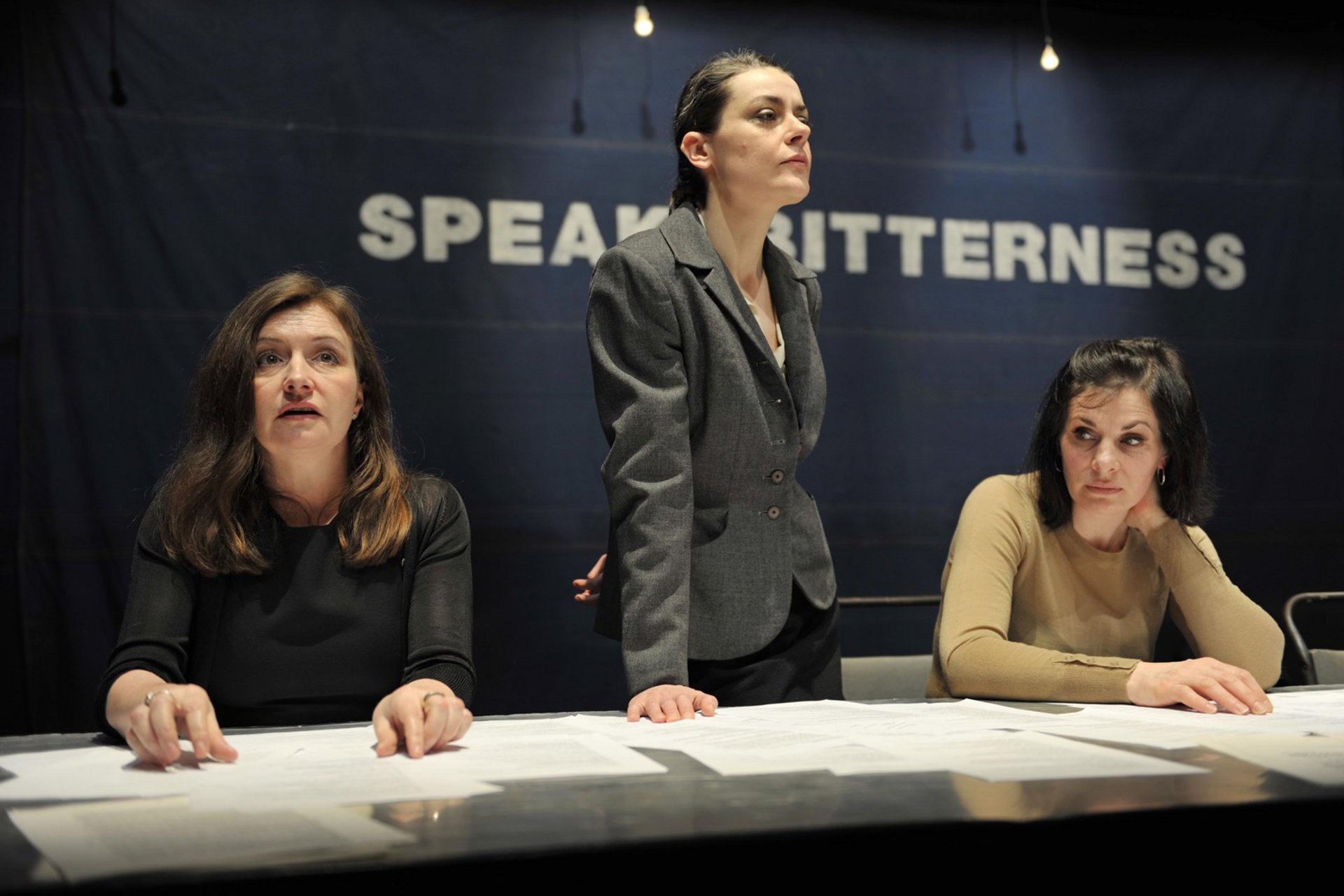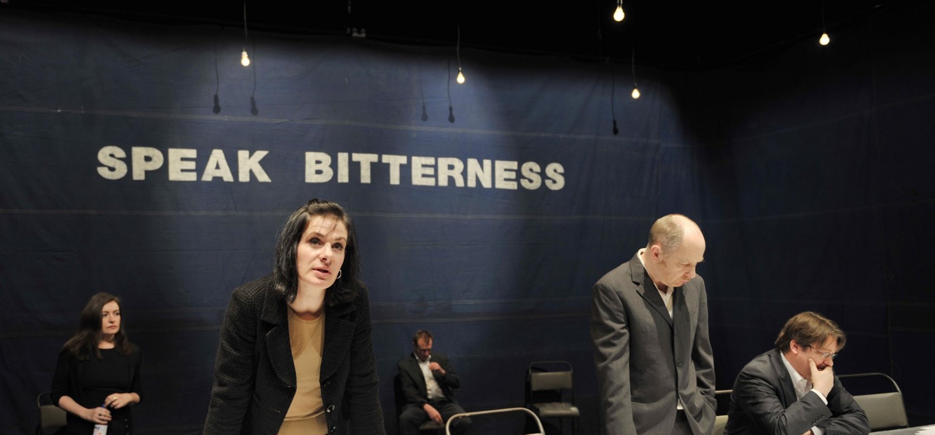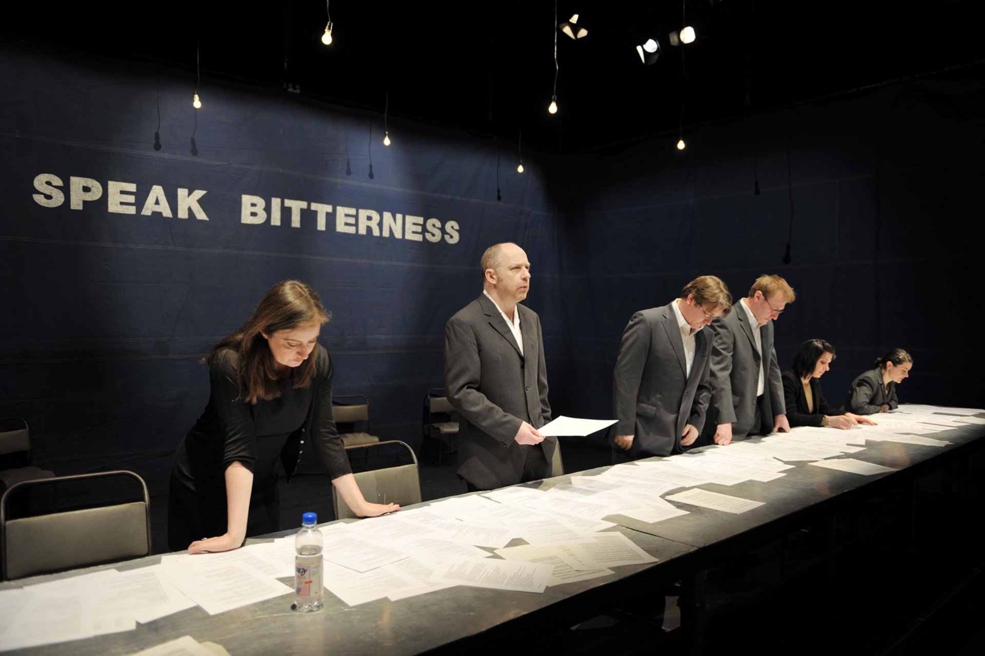 In der sechsstündigen Fassung der Performance "Speak Bitterness" tragen die Performer – mal widerwillig und eingeschüchtert, mal entschlossen oder gar heiter – eine lange Liste von Geständnissen vor: von kleinsten alltäglichen Versäumnissen bis hin zu den größten Vergehen der Weltgeschichte. Die Aufführung bietet die seltene Gelegenheit, alle Mitglieder der Kompanie Forced Entertainment gemeinsam auf der Bühne zu sehen.