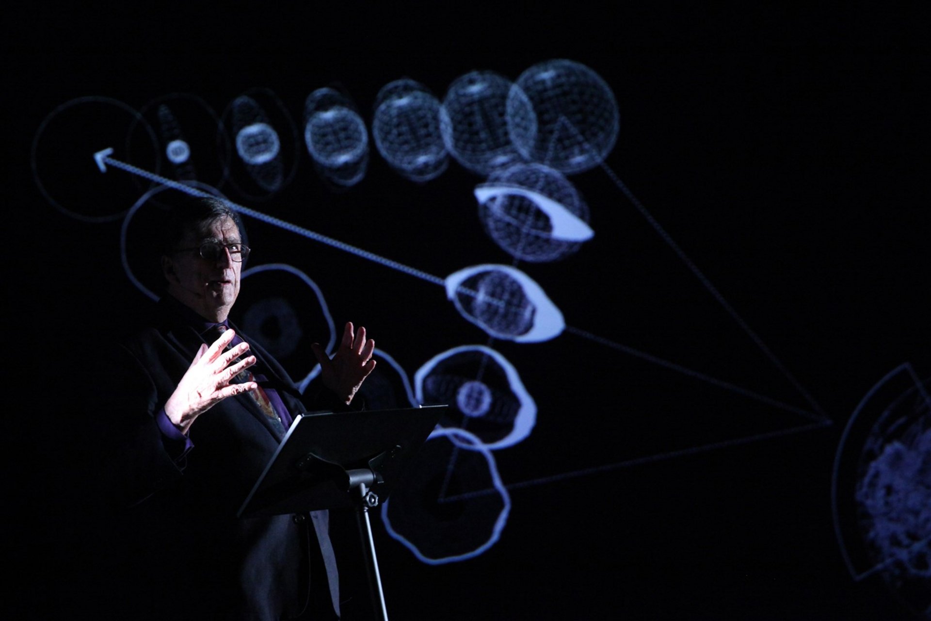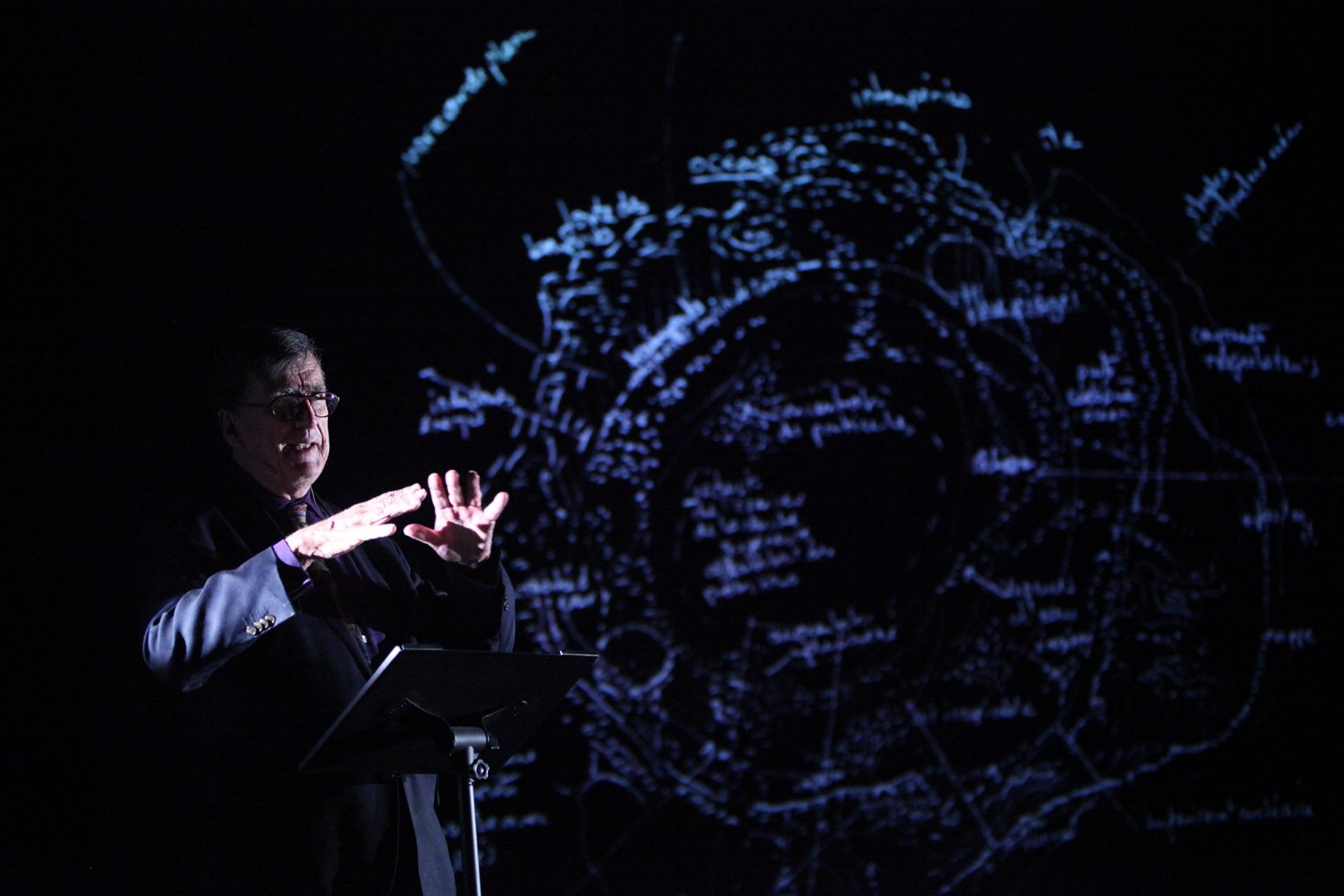Bruno Latour reflektiert in seiner Lecture-Performance, die er zusammen mit der Regisseurin Frédérique Aït-Touati entwickelt hat, das Verhältnis des Menschen zu seiner Umwelt. Platons Höhle ist für den Wissenschaftssoziologen kein potenzieller Rückzugsort, sondern symbolisiert unser Leben innerhalb der fragilen Stratosphäre der Erde. Jenseits der “kritischen Zone” gibt es kein Außen, in dem wir existieren können. Nicht-menschliche Lebewesen und Naturformen sollen als Teil einer anderen Topologie, der Gaïagraphie, angesehen werden.