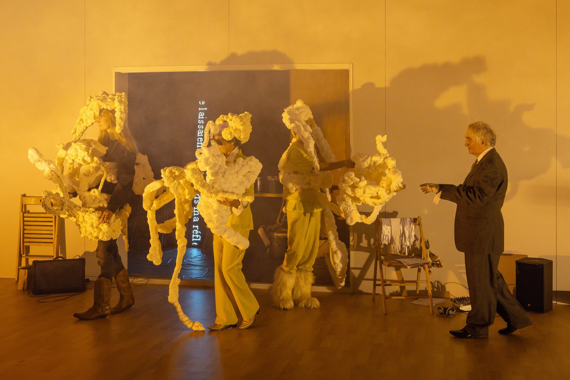 In Quesnes neuer Arbeit rückt nun eine kleine Gruppe von Freund*innen in den Mittelpunkt, die gemeinsam eine Kunstgalerie einrichtet. Auf der Bühne entsteht ein ebenso humorvolles wie poetisches Universum aus animierten Objekten, einem Pianola und Schaumstoffskulpturen. Das Stück untersucht erneut den Platz der Kunst im Alltag, während musikalische und visuelle Erfindungen auf die poetisch eigenwilligen Texte von Laura Vazquez treffen. Zwischen wirkungsvollen Effekten und absurden Situationen entsteht ein Theater der Nähe, das Menschen und Gegenstände in einer gemeinsamen, atmosphärischen Komposition versammelt und die Notwendigkeit des künstlerischen Akts betont, so klein er auch sein mag.